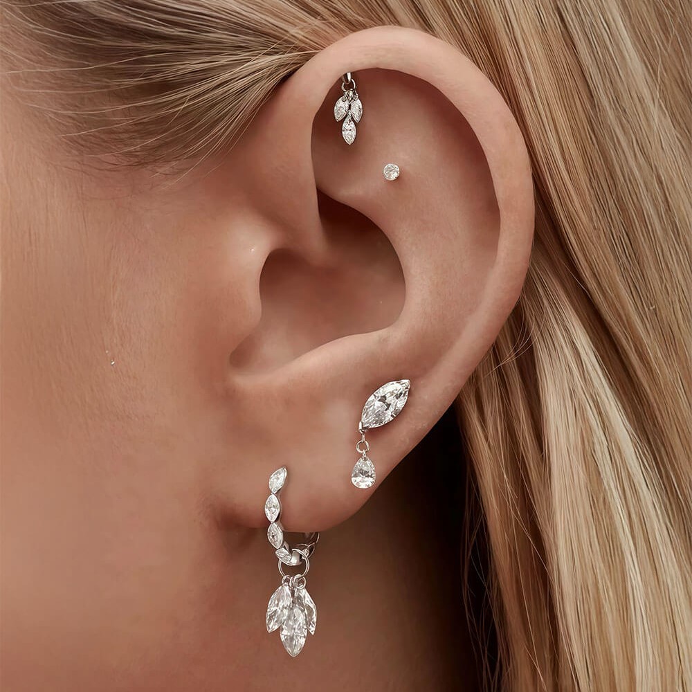 The rule that actually works: If you're building a three-piercing stack, choose pieces in the same metal color but with different stone shapes and decreasing sizes as you move up the ear. Same metal unifies. Different shapes create interest. Decreasing sizes create flow.
