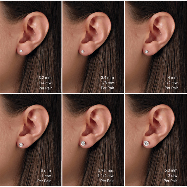 Recommended size range: 0.3ct–1ct depending on personal preference and earlobe size.